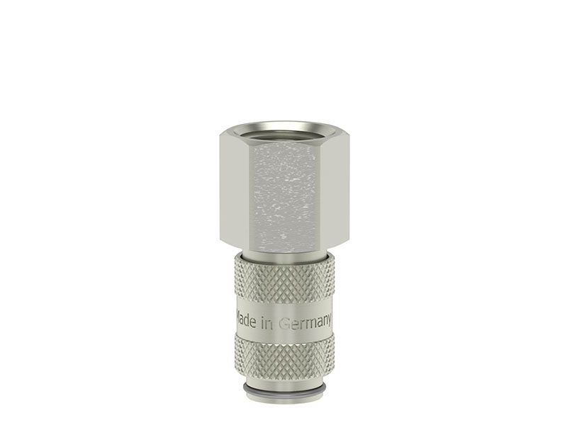 Gniazdo szybkozłącza obustronnie odcinającego z gwintem wewnętrznym, wykonane z mosiądzu (MS 58) niklowanego, z elementami ze stali szlachetnej i uszczelnieniem z gumy nitrylowej (NBR).