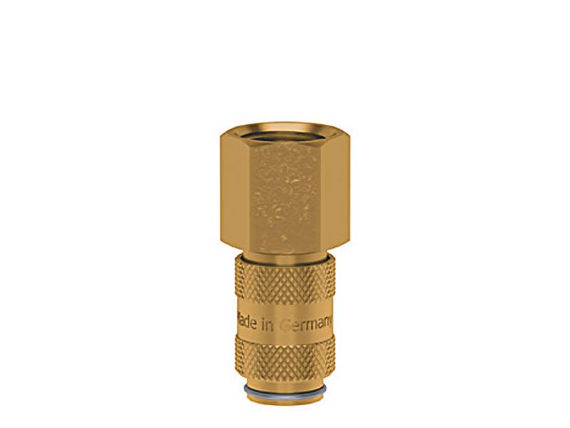Gniazdo szybkozłącza z wolnym przelotem, z gwintem wewnętrznym, wykonane z mosiądzu (MS 58), z elementami ze stali szlachetnej i uszczelnieniem z gumy nitrylowej (NBR).