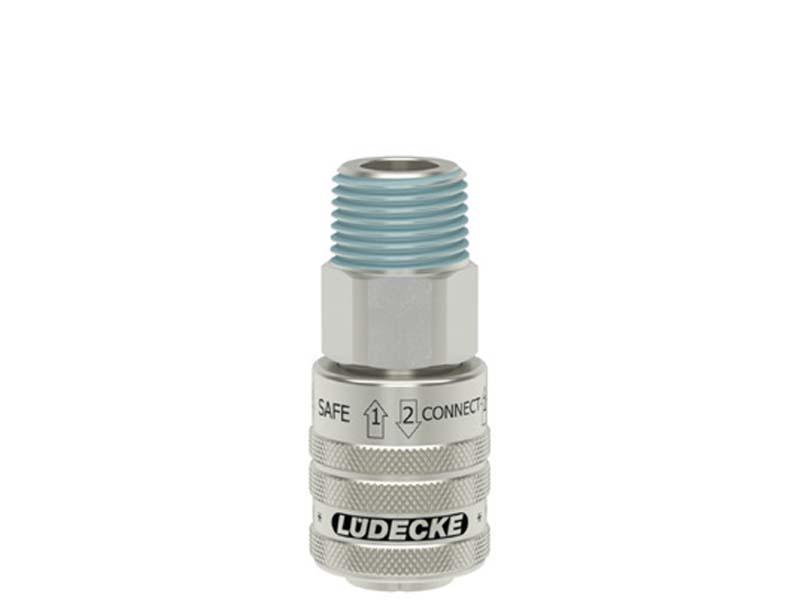 Gniazdo szybkozłączki jednostronnie odcinającej z powlekanym gwintem zewnętrznym, wykonane z mosiądzu (MS 58), z elementami ze stali hartowanej, stali szlachetnej i uszczelnieniem z gumy nitrylowej (NBR).