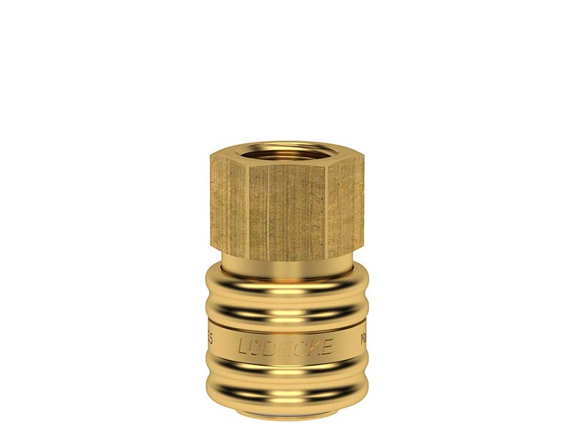Gniazdo szybkozłączki jednostronnie odcinającej z gwintem wewnętrznym, wykonane z mosiądzu (MS 58), z elementami ze stali szlachetnej i uszczelnieniem z gumy nitrylowej (NBR).