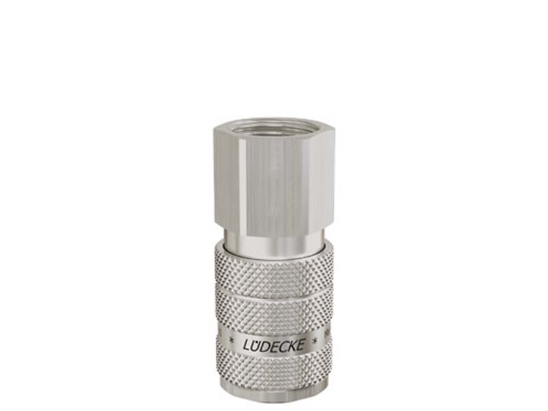 Gniazdo szybkozłączki dwustronnie odcinającej z gwintem wewnętrznym, wykonane z mosiądzu (MS 58), z elementami ze stali szlachetnej i uszczelnieniem z gumy nitrylowej (NBR).