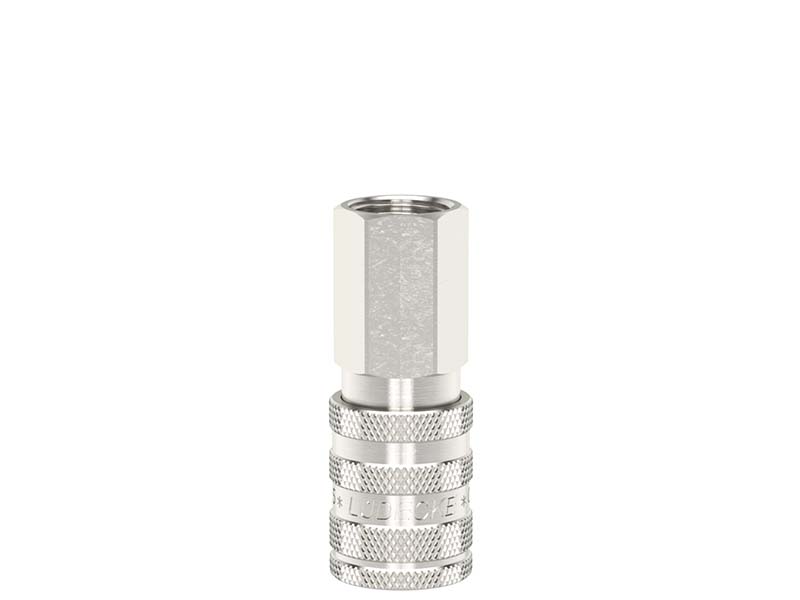 Gniazdo szybkozłączki jednostronnie odcinającej z gwintem wewnętrznym, wykonane z mosiądzu (MS 58) niklowanego, z elementami ze stali hartowanej, stali szlachetnej i uszczelnieniem z gumy nitrylowej (NBR).