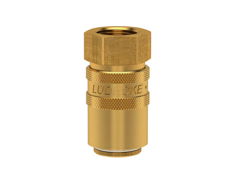Gniazdo szybkozłączki z gwintem wewnętrznym, wykonane z mosiądzu (MS 58), z elementami ze stali szlachetnej i uszczelnieniem z gumy fluorowej (FKM).