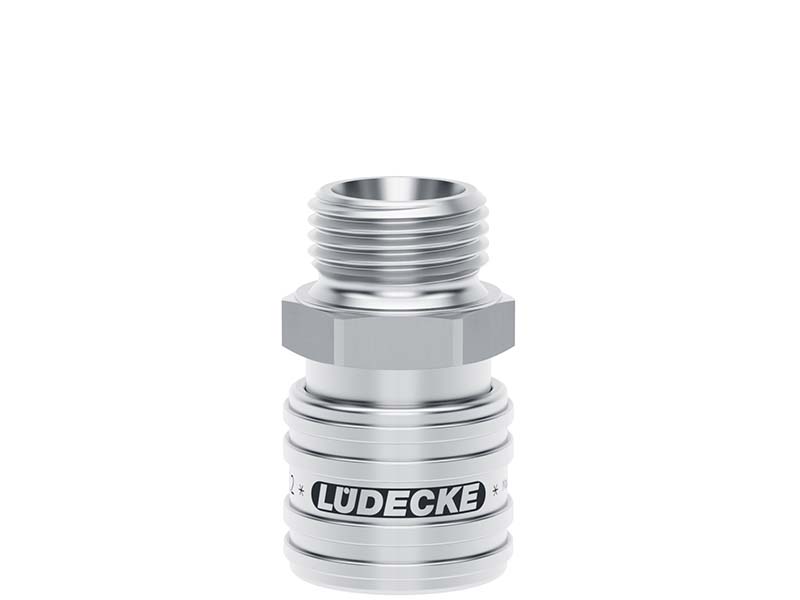 Gniazdo szybkozłącza bez zaworu z gwintem zewnętrznym, wykonane ze stali szlachetnej (nierdzewnej) i uszczelnieniem z Vitonu (FKM).