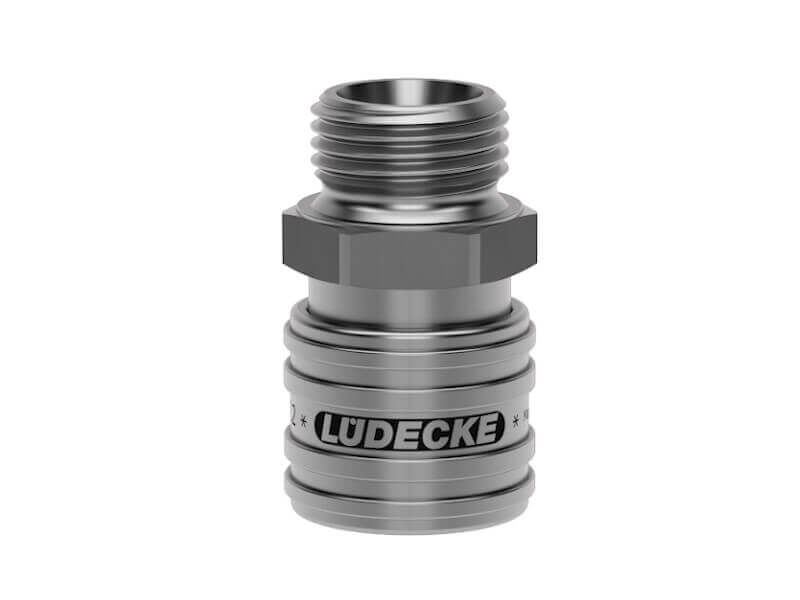 Gniazdo szybkozłącza dwustronnie odcinającego z gwintem zewnętrznym wykonane ze stali szlachetnej (nierdzewnej) i uszczelnieniem z Vitomu (FKM).