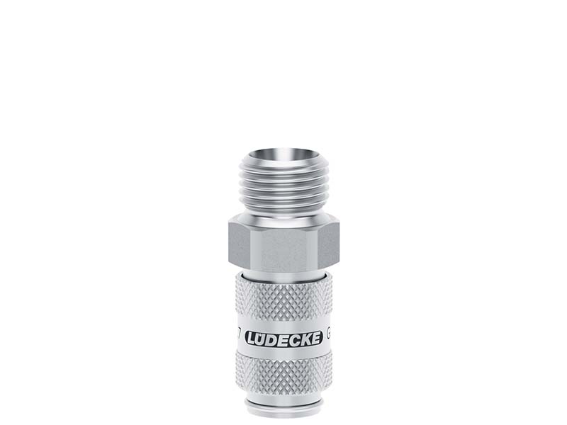 Gniazdo szybkozłącza jednostronnie odcinającego z gwintem zewnętrznym wykonane ze stali szlachetnej (nierdzewnej) i uszczelnieniem z Vitomu (FKM).