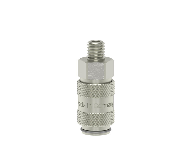 Gniazdo szybkozłącza jednostronnie odcinającego z gwintem zewnętrznym wykonane z mosiądzu (MS 58) niklowanego, z elementami ze stali szlachetnej i uszczelnieniem z gumy nitrylowej (NBR).