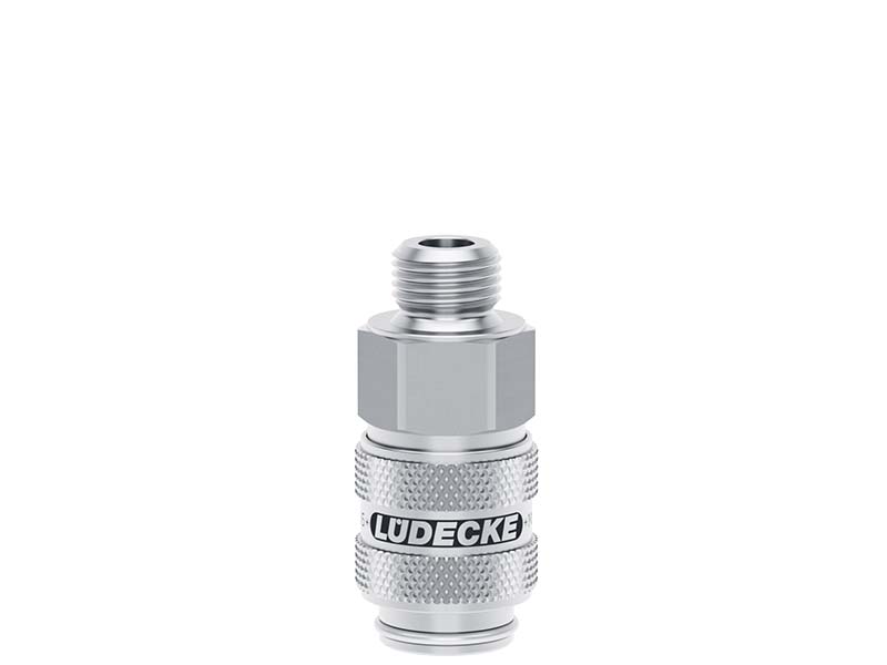 Gniazdo szybkozłącza bez zaworu z gwintem zewnętrznym, wykonane ze stali szlachetnej (nierdzewnej) i uszczelnieniem z Vitonu (FKM).
