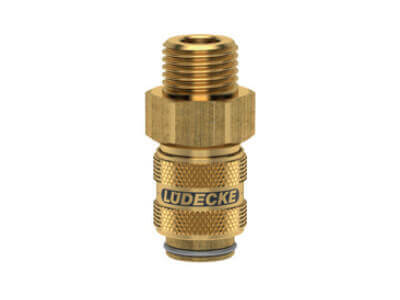 Gniazdo szybkozłączki z gwintem zewnętrznym, wykonane z mosiądzu (MS 58), z elementami ze stali szlachetnej i uszczelnieniem z gumy nitrylowej (NBR).