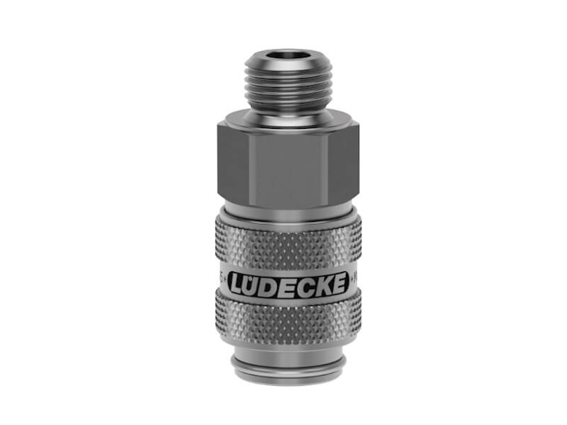 Gniazdo szybkozłącza jednostronnie odcinającego z gwintem zewnętrznym wykonane ze stali szlachetnej (nierdzewnej) i uszczelnieniem z Vitomu (FKM).