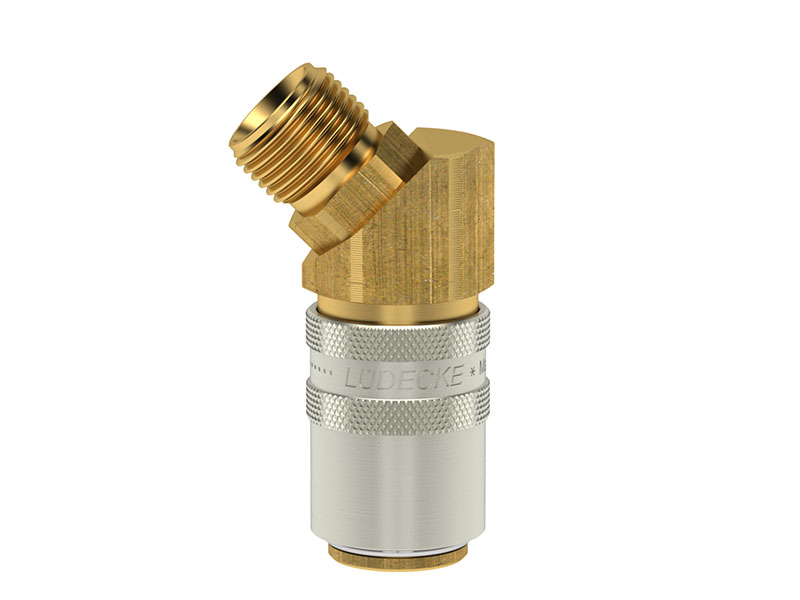 Gniazdo szybkozłączki z gwintem zewnętrznym, wykonane z mosiądzu (MS 58), z elementami ze stali szlachetnej, mosiądzu niklowanego i uszczelnieniem z gumy fluorowej (FKM).