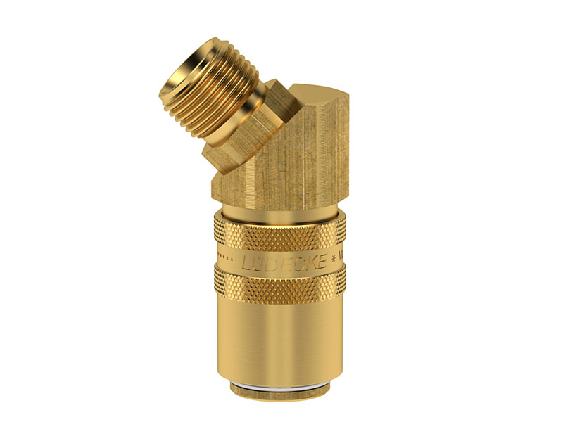 Gniazdo szybkozłączki z gwintem zewnętrznym, wykonane z mosiądzu (MS 58), z elementami ze stali szlachetnej i uszczelnieniem z gumy fluorowej (FKM).