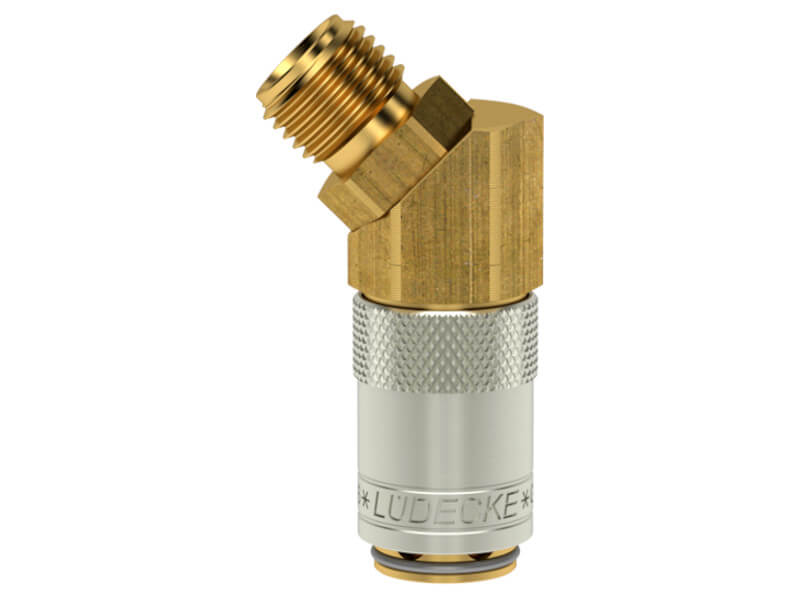Gniazdo szybkozłączki z gwintem zewnętrznym, wykonane z mosiądzu (MS 58), z elementami ze stali szlachetnej, mosiądzu niklowanego i uszczelnieniem z gumy fluorowej (FKM).