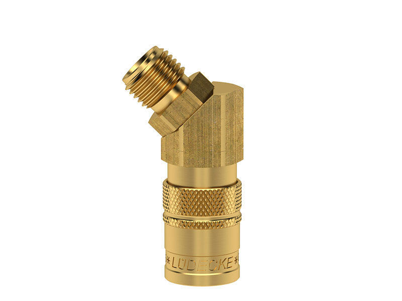 Gniazdo szybkozłączki z gwintem zewnętrznym, wykonane z mosiądzu (MS 58), z elementami ze stali szlachetneji uszczelnieniem z gumy fluorowej (FKM).