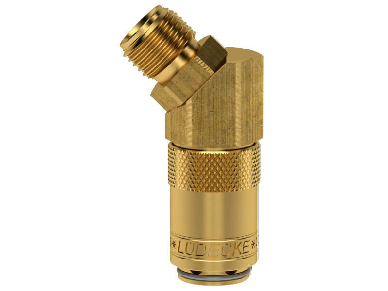 Gniazdo szybkozłączki z gwintem zewnętrznym, wykonane z mosiądzu (MS 58), z elementami ze stali szlachetnej i uszczelnieniem z gumy fluorowej (FKM).