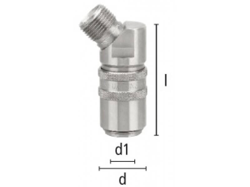 Gniazdo szybkozłączki z gwintem zewnętrznym, wykonane ze stali szlachetnej i uszczelnieniem z gumy fluorowej (FKM).