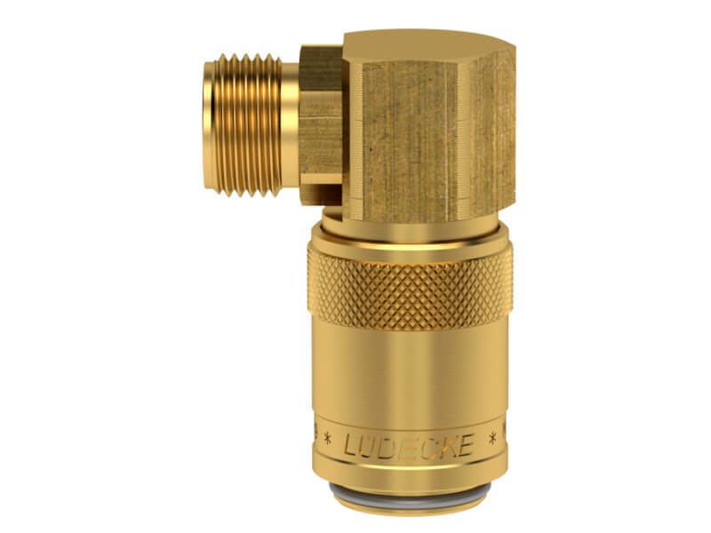 Gniazdo szybkozłączki z gwintem zewnętrznym, wykonane z mosiądzu (MS 58), z elementami ze stali szlachetnej i uszczelnieniem z gumy fluorowej (FKM).