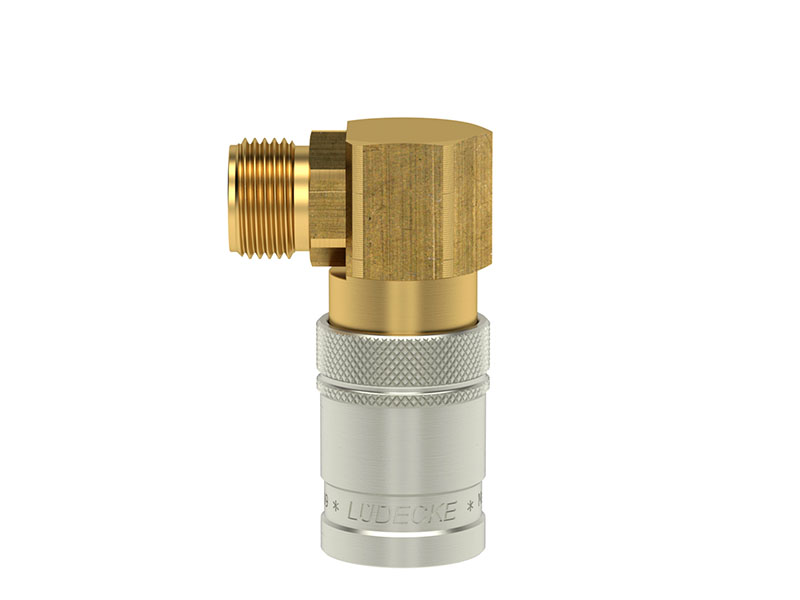Gniazdo szybkozłączki z gwintem zewnętrznym, wykonane z mosiądzu (MS 58), z elementami ze stali szlachetnej, mosiądzu niklowanego i uszczelnieniem z gumy fluorowej (FKM).