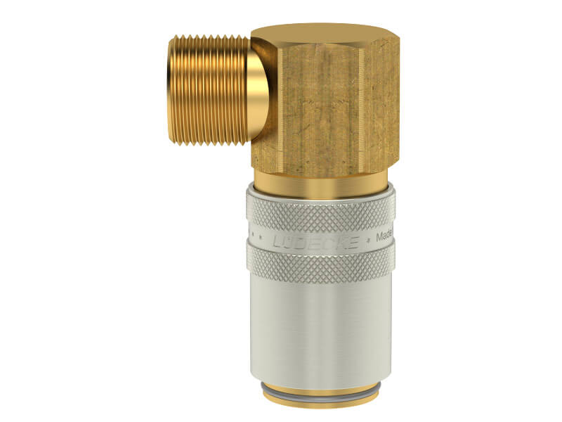 Gniazdo szybkozłączki z gwintem zewnętrznym, wykonane z mosiądzu (MS 58), z elementami ze stali szlachetnej, mosiądzu niklowanego i uszczelnieniem z gumy fluorowej (FKM).