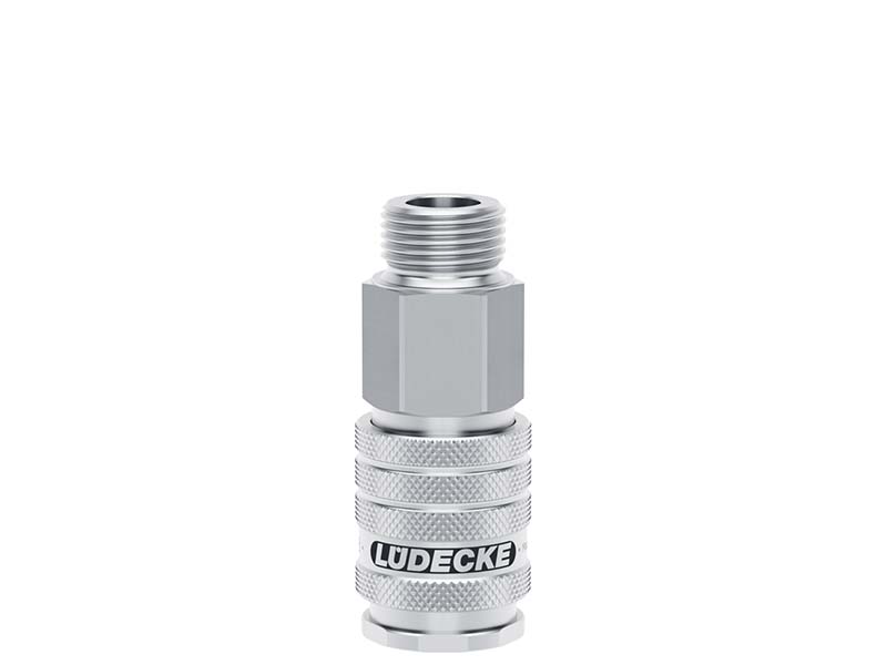 Gniazdo szybkozłącza dwustronnie odcinającego z gwintem zewnętrznym wykonane ze stali szlachetnej (nierdzewnej) i uszczelnieniem z Vitomu (FKM).