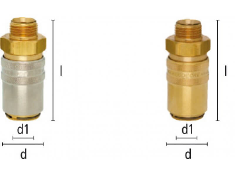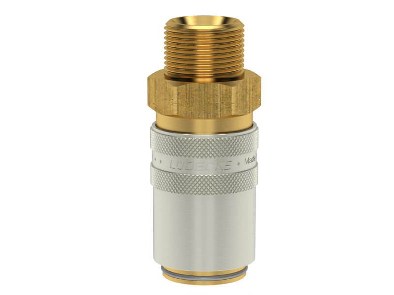 Gniazdo szybkozłączki z gwintem zewnętrznym, wykonane z mosiądzu (MS 58), z elementami ze stali szlachetnej, mosiądzu niklowanego i uszczelnieniem z gumy fluorowej (FKM).