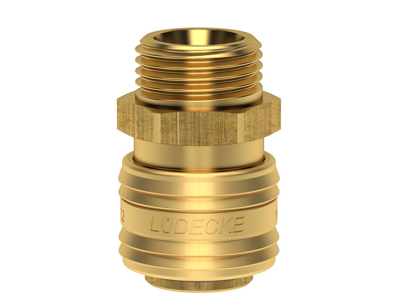 Gniazdo szybkozłącza jednostronnie odcinającego z gwintem zewnętrznym wykonane z mosiądzu (MS 58), z elementami ze stali szlachetnej i uszczelnieniem z gumy nitrylowej (NBR).