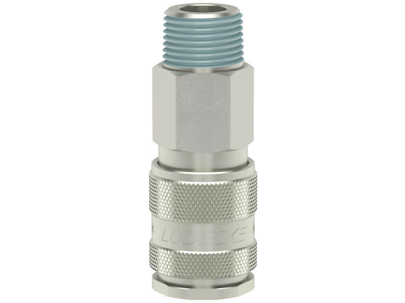 Gniazdo szybkozłączki jednostronnie odcinającej z powlekanym gwintem zewnętrznym, wykonane z mosiądzu (MS 58), z elementami ze stali szlachetnej, stali hartowanej i uszczelnieniem z gumy nitrylowej (NBR).