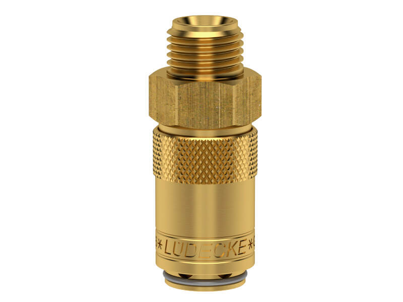 Gniazdo szybkozłączki z gwintem zewnętrznym, wykonane z mosiądzu (MS 58), z elementami ze stali szlachetnej i uszczelnieniem z gumy fluorowej (FKM).