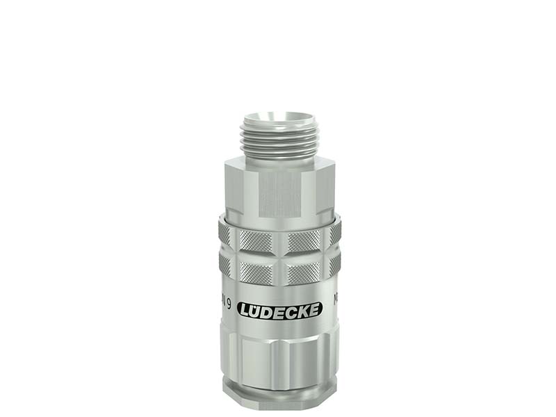 Gniazdo szybkozłączki z gwintem zewnętrznym, wykonane z mosiądzu (MS 58) niklowanego, z elementami ze stali szlachetnej i uszczelnieniem z gumy fluorowej (FKM).