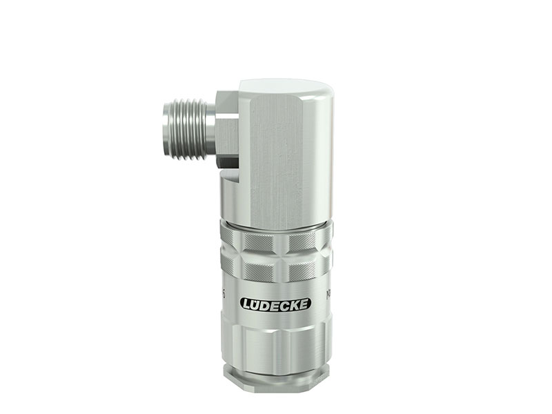 Gniazdo szybkozłączki z gwintem zewnętrznym pod kątem 90°, wykonane z mosiądzu (MS 58) niklowanego, z elementami ze stali szlachetnej i uszczelnieniem z gumy fluorowej (FKM).