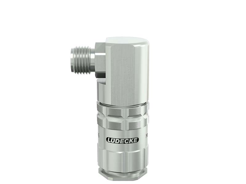 Gniazdo szybkozłączki z gwintem zewnętrznym pod kątem 90°, wykonane z mosiądzu (MS 58) niklowanego, z elementami ze stali szlachetnej i uszczelnieniem z gumy fluorowej (FKM).