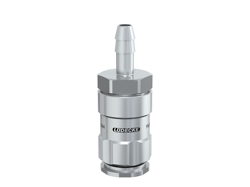 Gniazdo szybkozłączki z króćcem do węża, wykonane ze stali szlachetnej i uszczelnieniem z gumy fluorowej (FKM).
