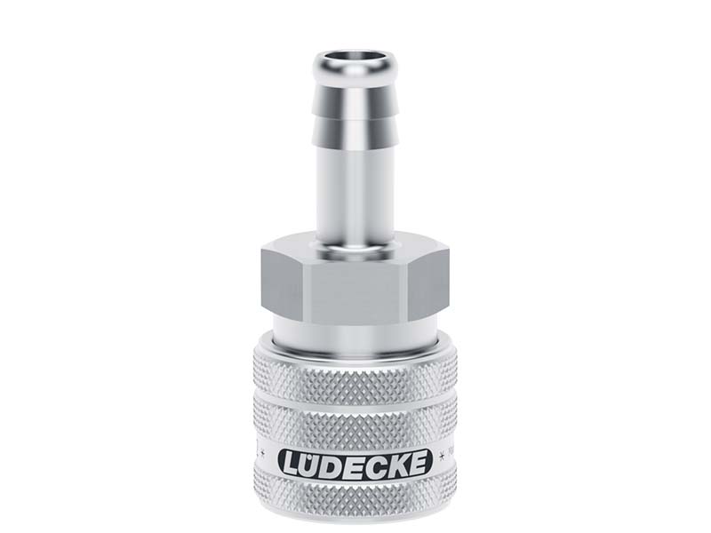 Gniazdo szybkozłącza bez zaworu z króćcem do węża, wykonane ze stali szlachetnej (nierdzewnej) i uszczelnieniem z Vitonu (FKM).
