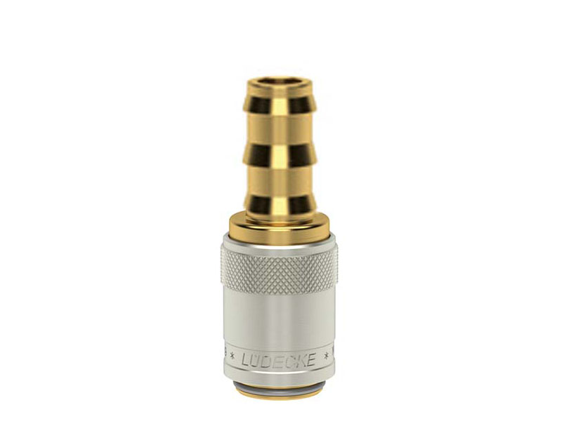 Gniazdo szybkozłączki z króćcem do węża, wykonane z mosiądzu (MS 58), z elementami ze stali szlachetnej, mosiądzu niklowanego i uszczelnieniem z gumy fluorowej (FKM).