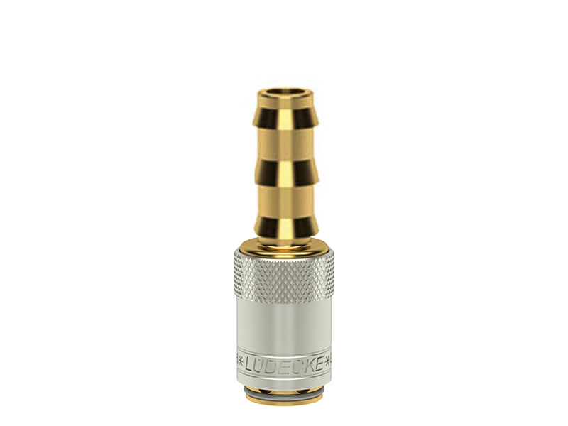 Gniazdo szybkozłączki z króćcem do węża, wykonane z mosiądzu (MS 58), z elementami ze stali szlachetnej, mosiądzu niklowanego i uszczelnieniem z gumy fluorowej (FKM).