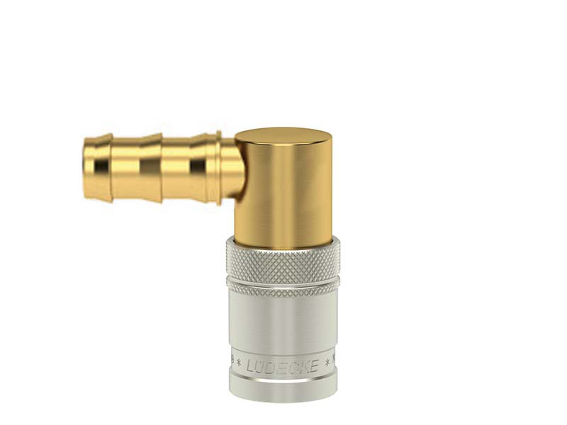Gniazdo szybkozłączki z króćcem do węża, wykonane z mosiądzu (MS 58), z elementami ze stali szlachetnej, mosiądzu niklowanego i uszczelnieniem z gumy fluorowej (FKM).