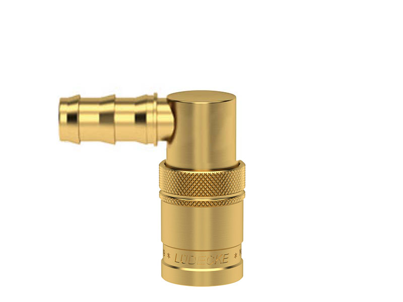 Gniazdo szybkozłączki z króćcem do węża, wykonane z mosiądzu (MS 58), z elementami ze stali szlachetnej i uszczelnieniem z gumy fluorowej (FKM).