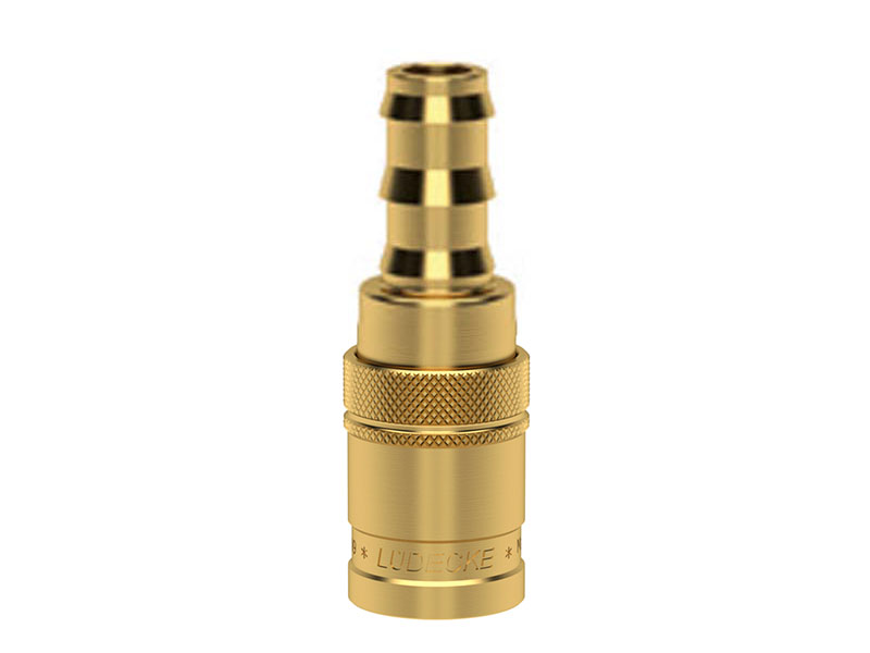 Gniazdo szybkozłączki z króćcem do węża, wykonane z mosiądzu (MS 58), z elementami ze stali szlachetnej i uszczelnieniem z gumy fluorowej (FKM).