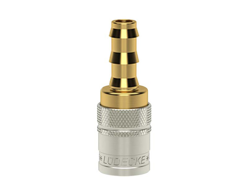 Gniazdo szybkozłączki z króćcem do węża, wykonane z mosiądzu (MS 58), z elementami ze stali szlachetnej, mosiądzu niklowanego i uszczelnieniem z gumy fluorowej (FKM).