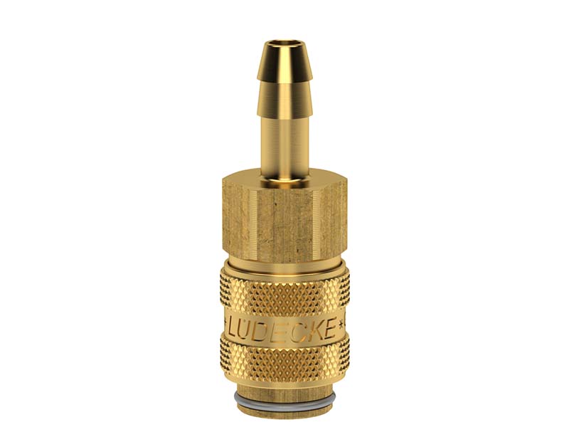 Gniazdo szybkozłącza wolnym przelotem z króćcem do węża, wykonane z mosiądzu (MS 58), z elementami ze stali szlachetnej i uszczelnieniem z gumy nitrylowej (NBR).