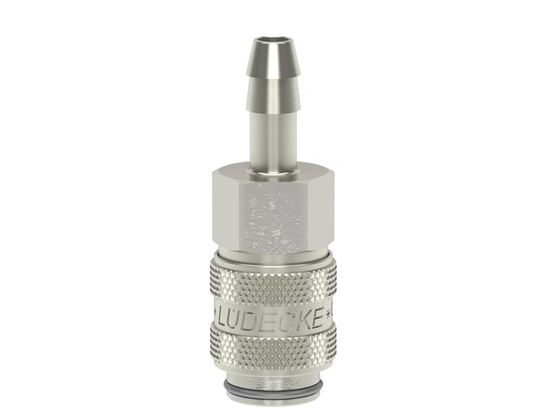 Gniazdo szybkozłącza wolnym przelotem z króćcem do węża, wykonane z mosiądzu (MS 58) niklowanego, z elementami ze stali szlachetnej i uszczelnieniem z gumy nitrylowej (NBR).