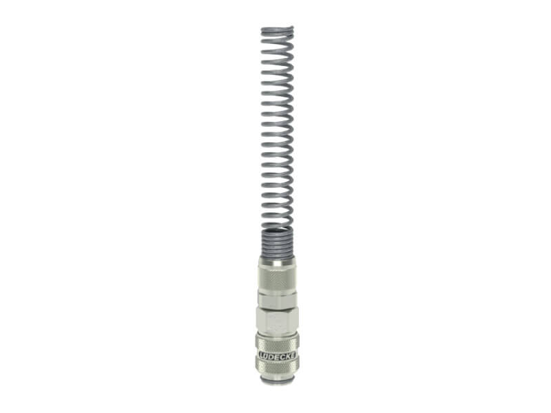 Gniazdo szybkozłącza obustronnie odcinającego z króćcem i nakrętką zaciskową, sprężyną ochronną na wąż, wykonane z mosiądzu (MS 58) niklowanego, z elementami ze stali szlachetnej i uszczelnieniem z gumy nitrylowej (NBR).