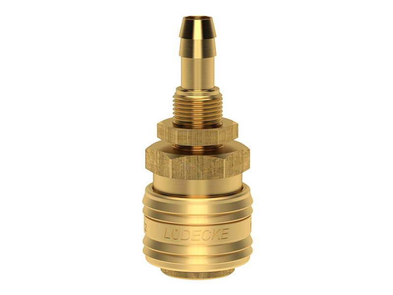 Gniazdo szybkozłączki z króćcem do węża, z nakrętką kontrującą, wykonane z mosiądzu (MS 58), z elementami ze stali szlachetnej i uszczelnieniem z gumy nitrylowej (NBR).