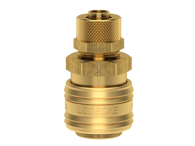 Gniazdo szybkozłączki z wolnym przelotem z króćcem do węża i nakrętką zaciskową, wykonane z mosiądzu (MS 58), z elementami ze stali szlachetnej i uszczelnieniem z gumy nitrylowej (NBR).