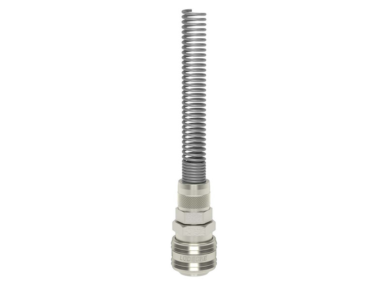 Gniazdo szybkozłączki z króćcem do węża, z nakrętką zaciskową i spiralą ochronną na wąż, wykonane z mosiądzu (MS 58) niklowanego, z elementami ze stali szlachetnej i uszczelnieniem z gumy nitrylowej (NBR).