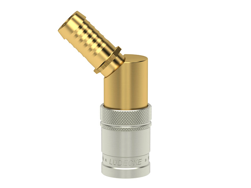 Gniazdo szybkozłączki z króćcem do węża, wykonane z mosiądzu (MS 58), z elementami ze stali szlachetnej, mosiądzu niklowanego i uszczelnieniem z gumy fluorowej (FKM).