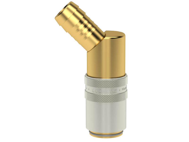 Gniazdo szybkozłączki z króćcem do węża, wykonane z mosiądzu (MS 58), z elementami ze stali szlachetnej, mosiądzu niklowanego i uszczelnieniem z gumy fluorowej (FKM).