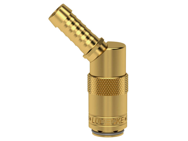 Gniazdo szybkozłączki z króćcem do węża, wykonane z mosiądzu (MS 58), z elementami ze stali szlachetnej i uszczelnieniem z gumy fluorowej (FKM).