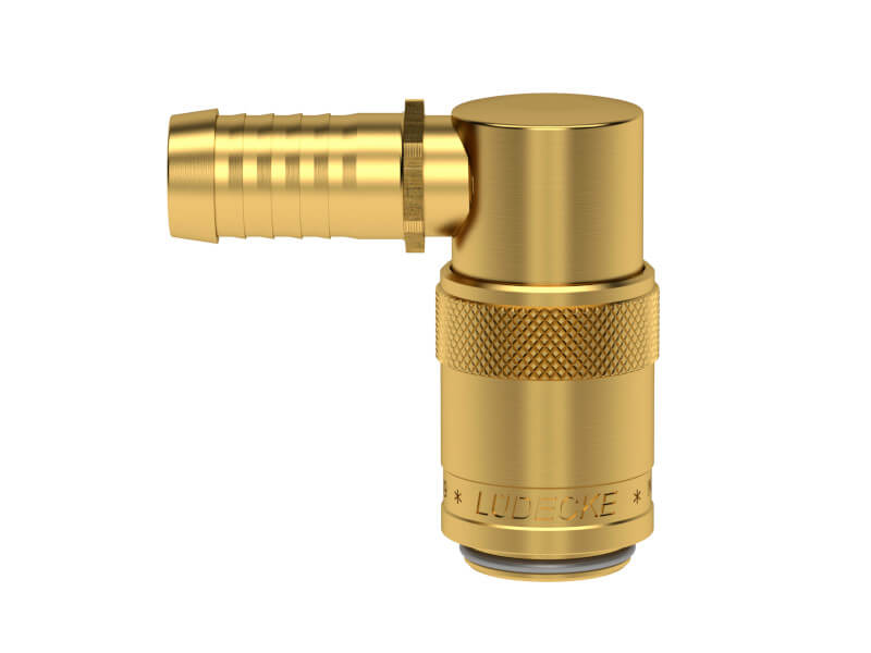 Gniazdo szybkozłączki z króćcem do węża, wykonane z mosiądzu (MS 58), z elementami ze stali szlachetnej i uszczelnieniem z gumy fluorowej (FKM).