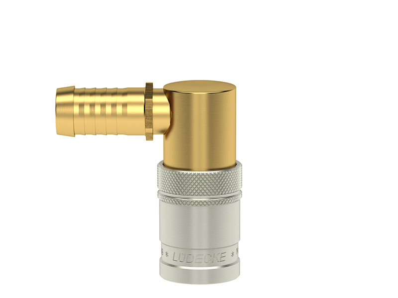Gniazdo szybkozłączki z króćcem do węża, wykonane z mosiądzu (MS 58), z elementami ze stali szlachetnej, mosiądzu niklowanego i uszczelnieniem z gumy fluorowej (FKM).